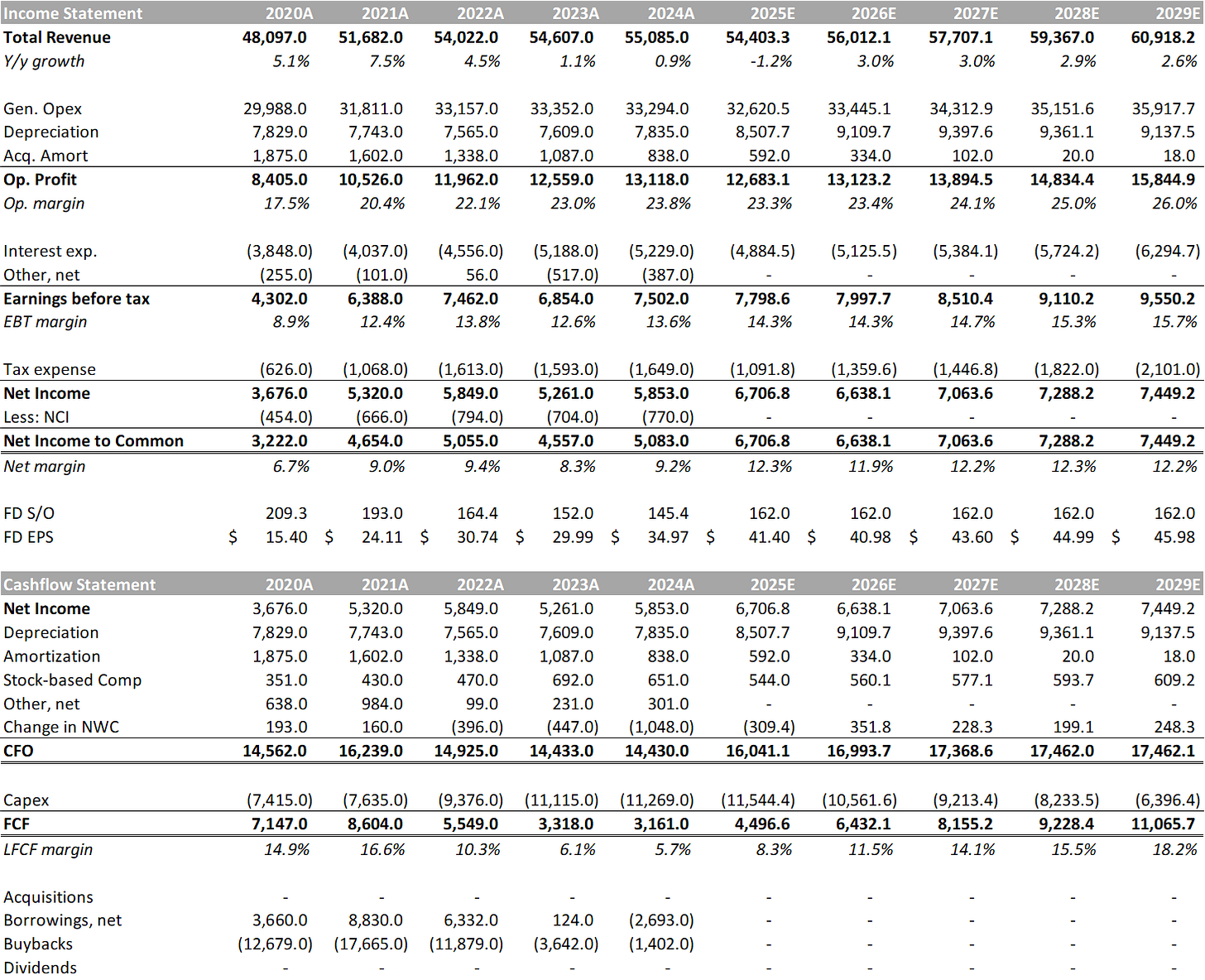 Bull case: broadband subscribers will stabilize / grow --> stable / growing cashflows + massive buybacks --> massive increase in FCF / share --> stock will deliver high IRR