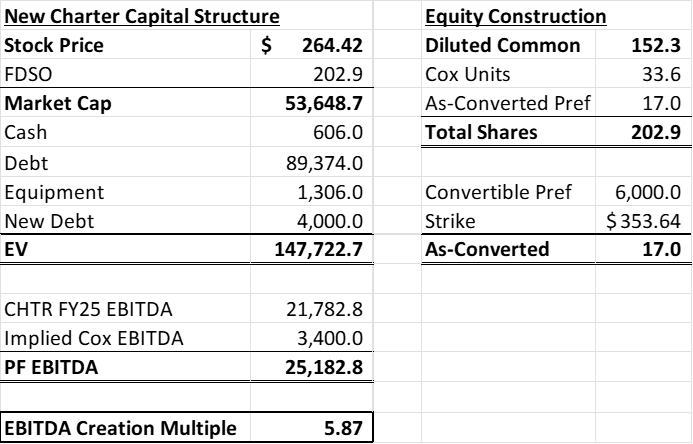 Structurally, Charter intends to assume Cox’s name (seemingly a nod to the Cox family's interest in their legacy), but will retire the Cox cable brand in favor of Spectrum (this makes sense as Spectrum is a household name while Cox is not). The deal is structured as $4b in cash, $6b in 6.875% convertible preferred, and 33.6m common units. On a fully converted basis, the Cox family will own 23% of Charter pro forma.