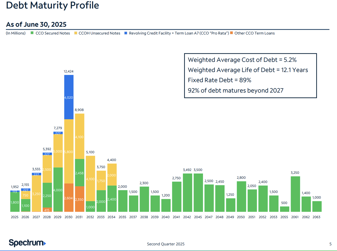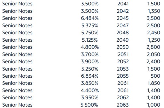 A unique and perhaps underappreciated aspect of the Charter capital structure is its long-dated and low-rate capital stack. The majority of Charter’s debt (89%) is fixed-rate with a WA interest of only 5.2%. This debt acts as an asset to shareholders as duration significantly lowers the value of the debt stack. We value Charter using the Level 1/2 fair market values of the debt to capture this benefit. Below we’ve snipped the 2040 and onward fixed rate maturities (par value on far right):
